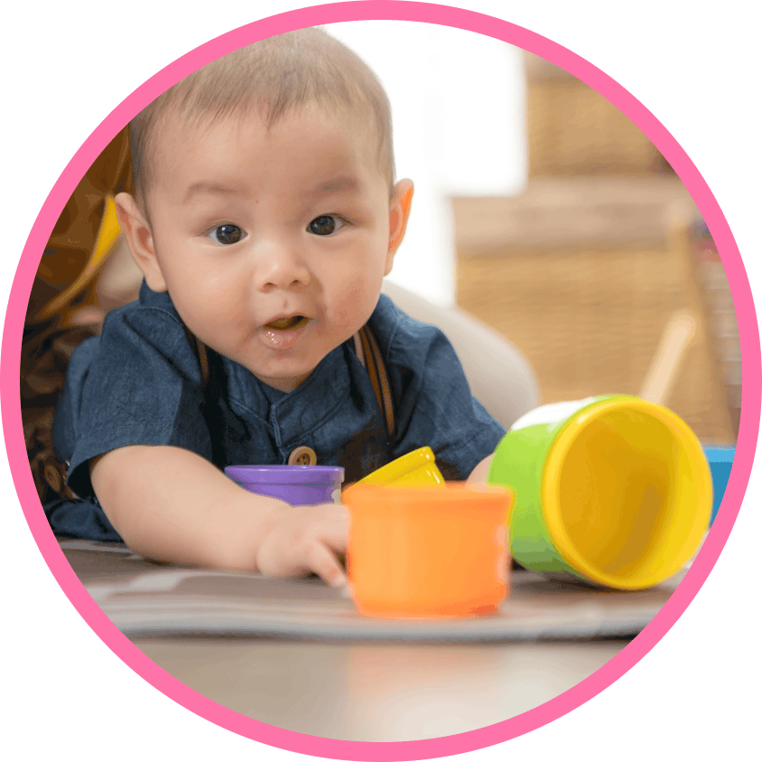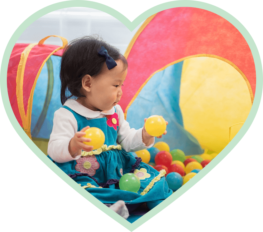 Our infant program keeps babies engaged with nursery rhymes, finger plays, lullabies, baby sign language, and interactive games like peek-a-boo, supporting early social and communication development. Infants also work on fine and gross motor development daily.